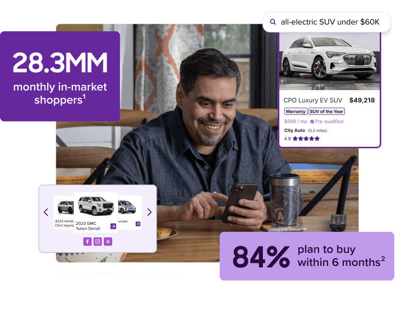 Reach and influence consumers you know are in-market (because they were just on Cars.com) to choose your brand and your vehicles. From powerful Why Buy brand awareness campaigns to dynamic inventory ads — you can become their first consideration at every turn to efficiently grow market share.