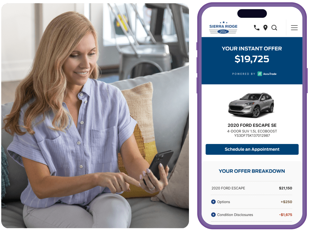It’s essential to have one consistent appraisal source powering your online and in-store experiences. That’s why Dealer Inspire is seamlessly integrated with AccuTrade — enabling website visitors to generate their own instant offers online and then seamlessly continue the same transaction at your store.