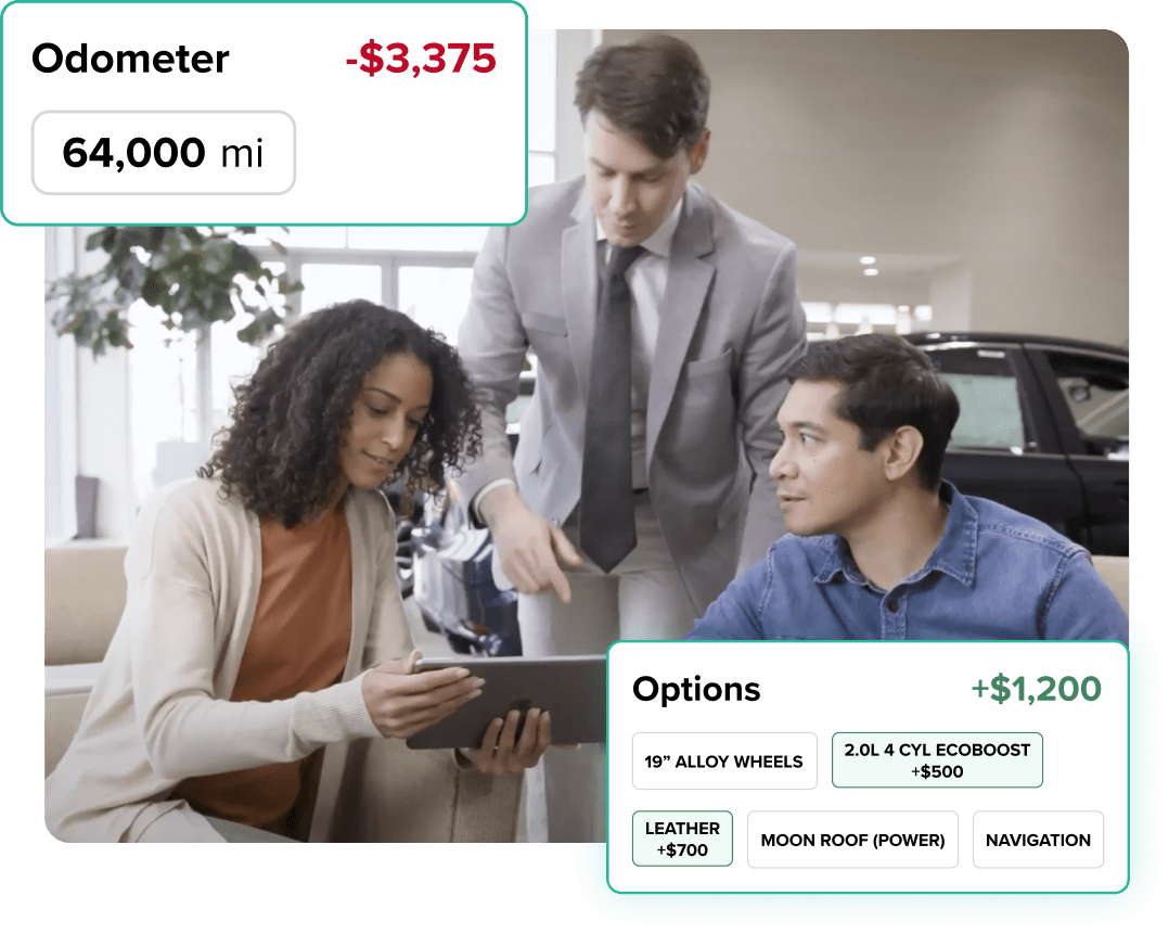 With an easy step-by-step experience and transparent insight into how each detail factors into the valuation process, AccuTrade gives your team and your customers the confidence to complete appraisals and transact — whether they’re in the showroom, service drive, or online.