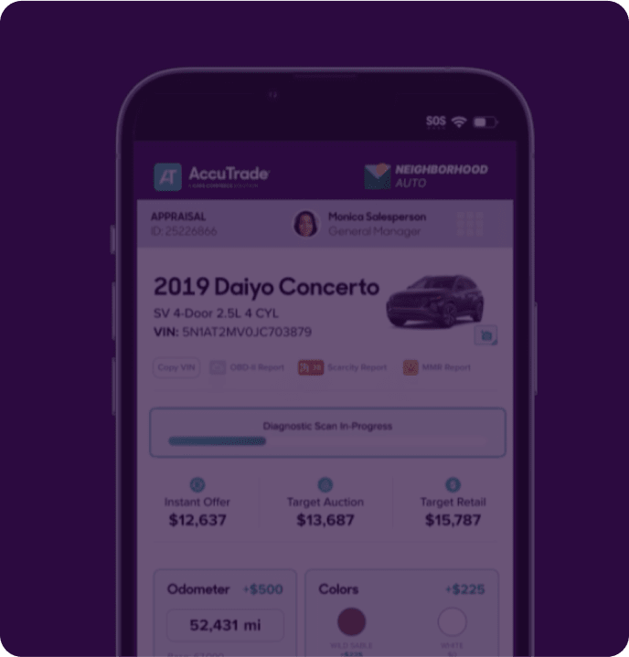 AccuTrade uses real-time market data and diagnostic scans to determine the right offer for every VIN in minutes, empowering your team to scale appraisals with confidence.