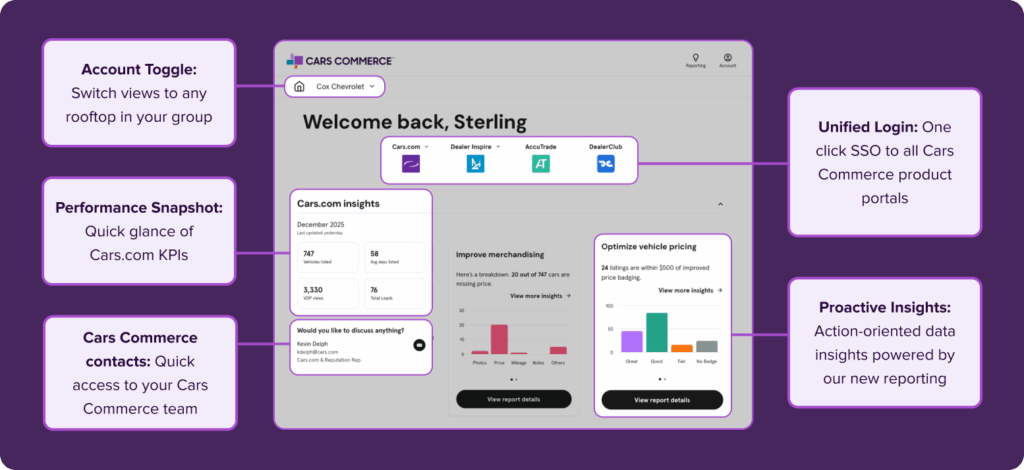 Managing multiple logins and scattered reports costs you time and clarity. The new Cars Commerce Hub solves this: one sign-on, consolidated reporting, and enhanced Cars.com insights with new market signals — all designed to help you act faster.