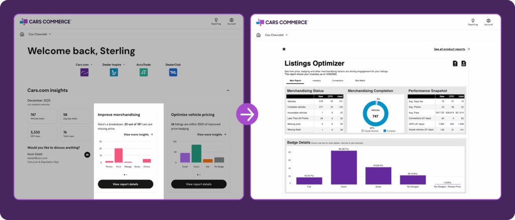 Each insight links directly to the action you need to take, whether that’s updating listings, reviewing connections, or adjusting pricing strategy. Most of the action items you will see today will focus on Cars.com performance, but we’ll be continuing to expand insight alerts throughout 2026 to cover all of your Cars Commerce solution solutions.