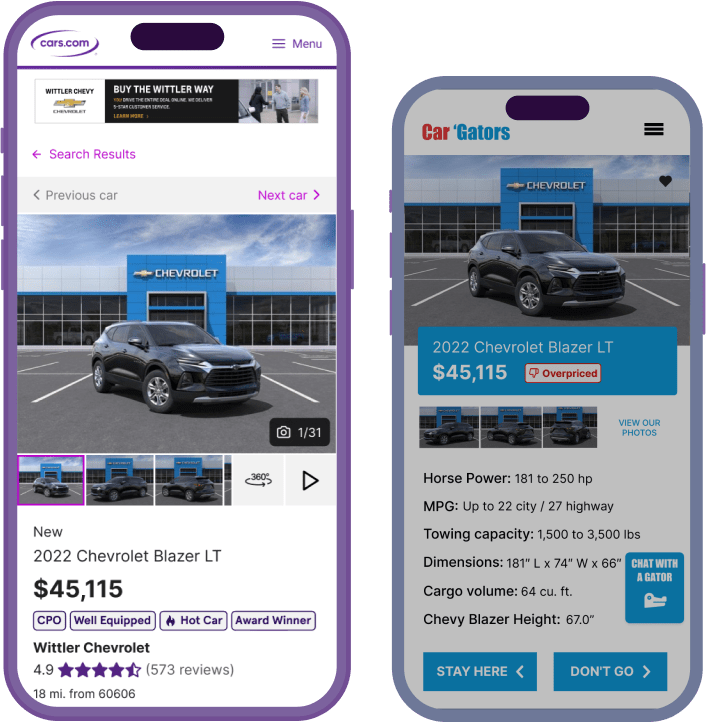 While reaching car shoppers through digital advertising becomes increasingly complex and inefficient (see: expensive), Cars.com gives you the trusted platform to meet shoppers when and where you know they are looking for their next car. It’s that simple.