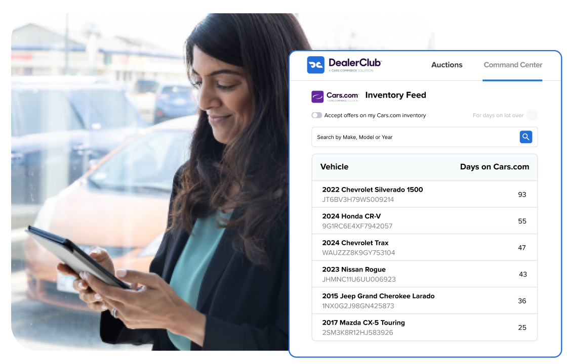 DealerClub’s Frontline Wholesale Lane gives Cars.com dealers another channel to turn slow-moving vehicles into someone else’s must-haves. Set rules by days on lot for those units to automatically surface to thousands of dealers with transparent reputations. Offers come directly to you. Accept, counter, or pass on your terms.