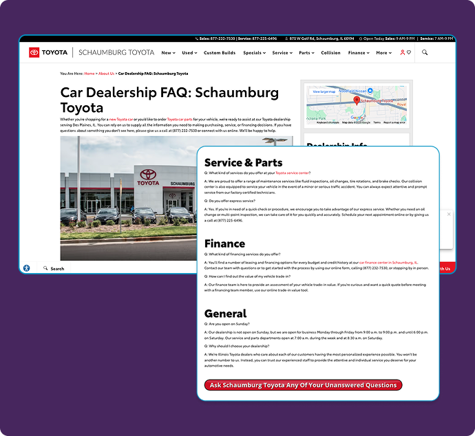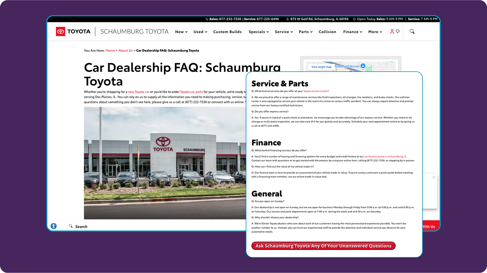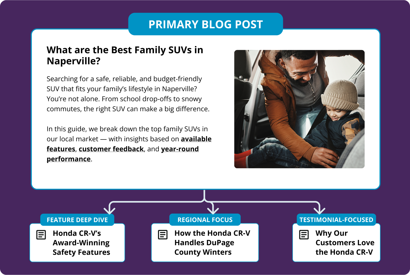 Your landing pages are foundational. Each one should act as an “answer hub” for a specific shopper need, e.g. “Brake Repair in Aurora” or “Honda CR-V Lease Deals in Chicago.” These pages do double duty: they help traditional rankings and signal to AI systems that you’re a trusted source of specific answers.