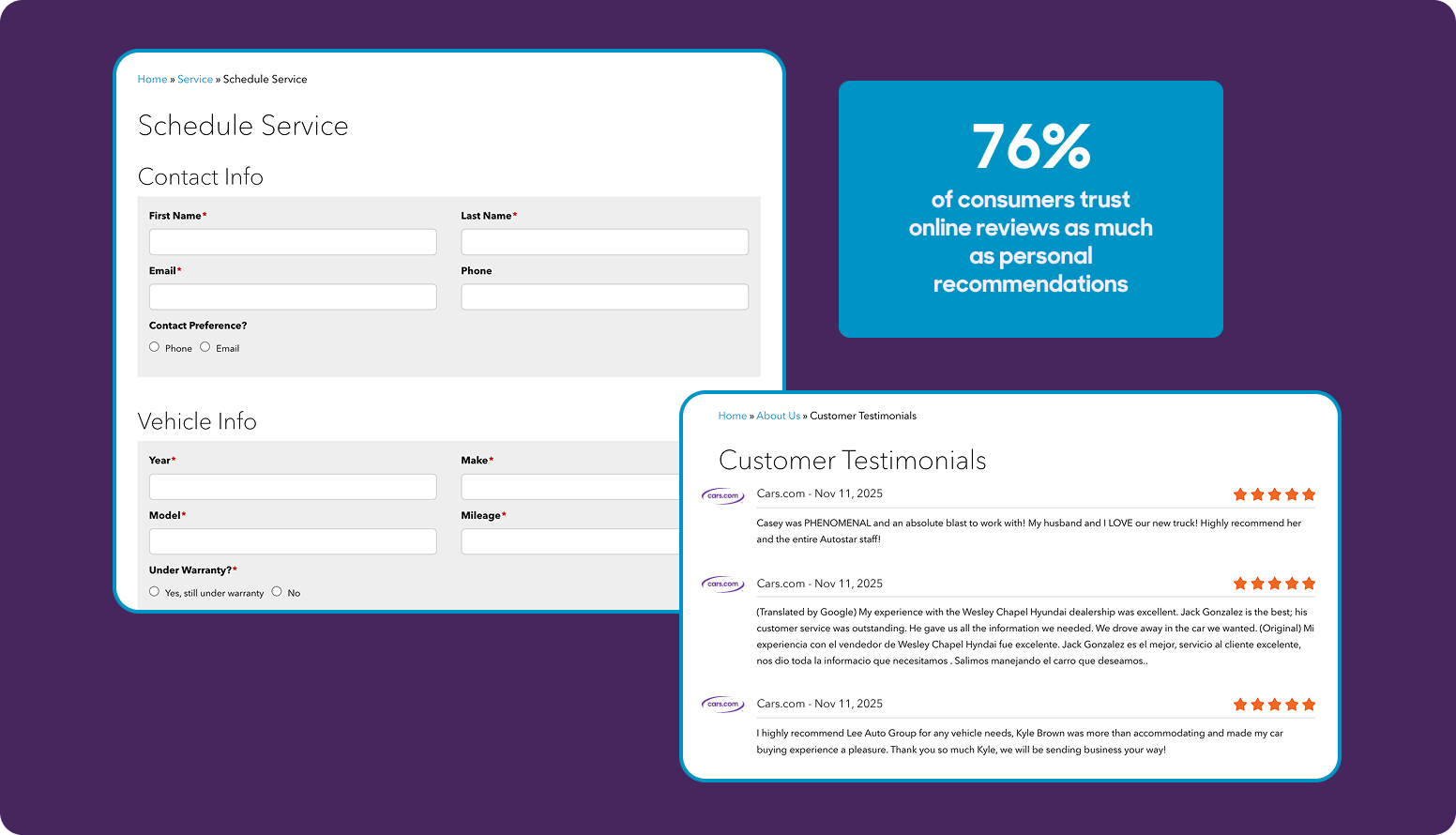 - Can I trust you? Embed social proof where it matters most, next to your appointment scheduler. Star ratings and recent reviews can tip an undecided customer toward clicking “Book Now” instead of calling three other dealerships for quotes. According to BrightLocal’s consumer review survey, 76% of consumers trust online reviews as much as personal recommendations2. Place testimonials strategically, not buried at the bottom of the page, but integrated into the scheduling page where they’ll actually influence decision-making.